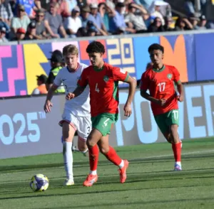 Ismaël Baouf avec le maillot du Maroc U20 face à la France en demi-finale du Mondial U20 au Chili.